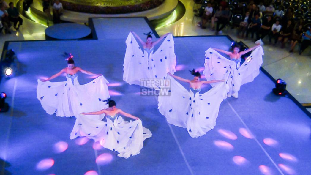 The actors appear on stage in elegant white costumes adorned with unique peacock designs inspired by the beautiful feathers of white peacocks. A magnificent combination of costumes and acting skills immerses the audience in an atmosphere of mystery and beauty of the magnificent world of peacocks.