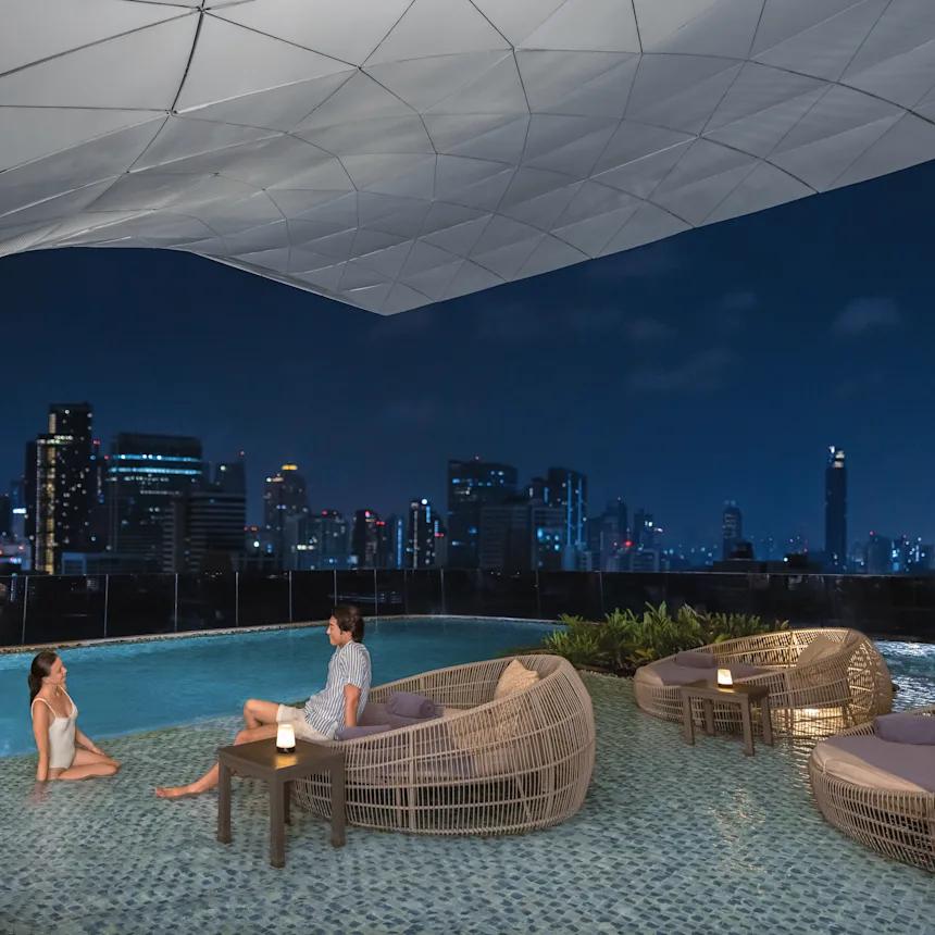 Просторные номера здесь не просто комфортабельны — они словно созданы для лёгкого вальса: высокие потолки, изысканные ткани, панорамные окна, в которых раскинулся город как на картине. На шестнадцатом этаже — безмятежный пейзаж с бесконечным бассейном, парящей линией горизонта и прохладным коктейлем в руке. А за пределами отеля — живая душа Бангкока: культурные достопримечательности, бутики высокой моды и идеальная транспортная доступность, чтобы покорять мегаполис без суеты