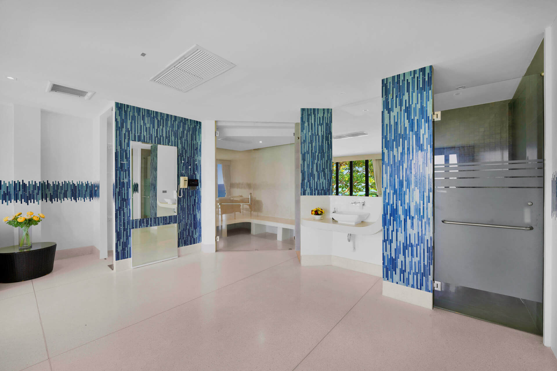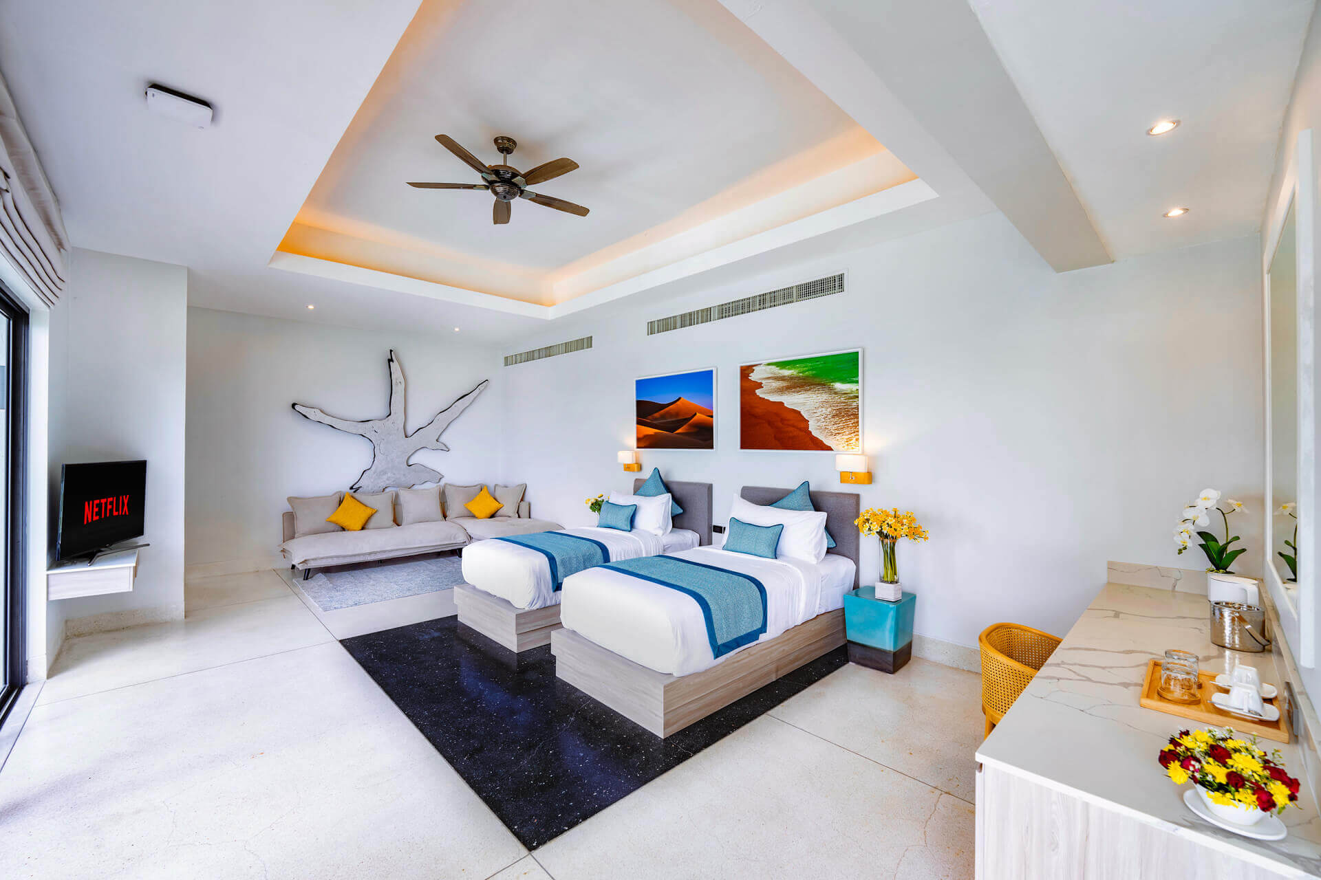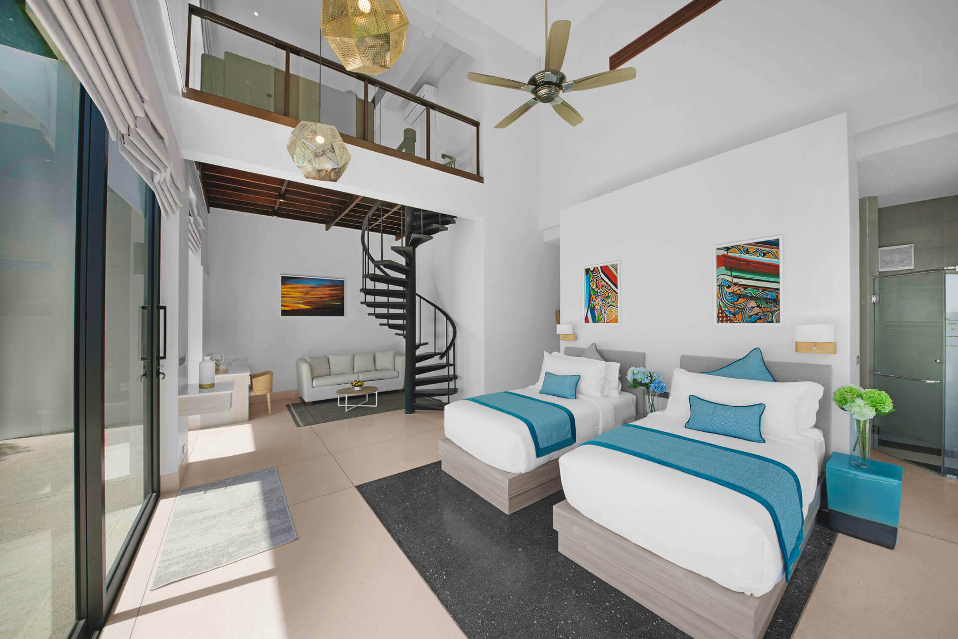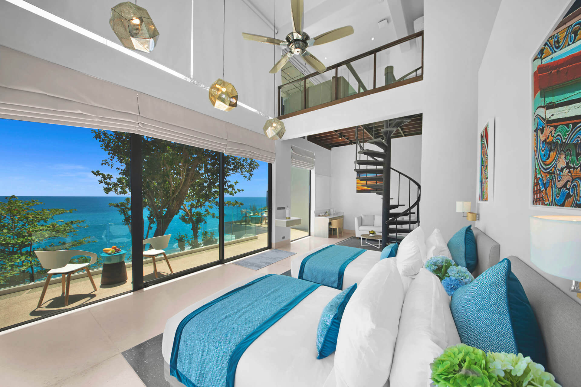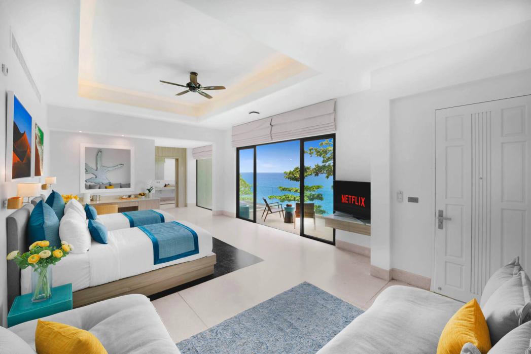 Семь просторных спален оформлены в спокойных тонах, оснащены кроватями king-size, рабочими столами, Smart TV, мини-барами и ванными комнатами с премиальными удобствами. Особый шарм добавляет дуплекс-спальня с интерьером в стиле лофт, где кровать king-size может быть разделена на две односпальные.